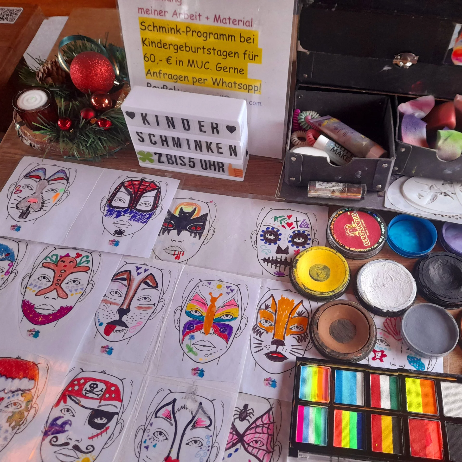 Meine jahrelange Arbeit als Pädagogin und Make-up Artistin haben mir die künstlerische Arbeit mit Kindern sozusagen auf den Leib geschneidert. Ich bringe viel Feingefühl und handwerkliche Kompetenz mit, um Kindergesichter mit einer farbigen Maske zu verwandeln. Durch mein künstlerisches Geschick kann ich auch auf spontane Motivwünsche eingehen und etwas Neues, ausserhalb meiner Vorlagen kreieren (für Tiere, die ich nicht kenne, gibt es ja Google ;). Auch kleineren Verwandlungskünstlern, die noch nicht lange stillsitzen können, kann ich in kurzer Zeit eine kleine Maske aufs Gesicht zaubern. Das Ergebnis: Strahlende Kinderaugen beim Blick in den Spiegel und jubelnde Eltern. Zu meinen Events bringe ich eine große Auswahl an Motiven mit, angepasst an Jahreszeit und Motto z.B. Fasching, Ostern, Weihnachten, Superhelden, Schmetterlinge, Meerjungfrauen oder Halloween.