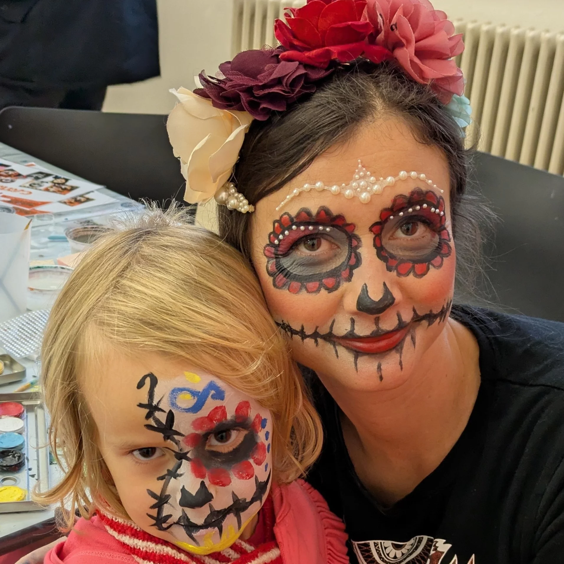 Ich arbeite hygienisch und mit Naturfarben, die hypoallergen und dermatologisch getestet sind. Zum abschminken braucht es später nur einen Waschlappen mit warmem Wasser, am schnellsten geht Mikrofaser. Über Nacht sollte die Farbe nicht drauf bleiben, da die äußersten Hautpartikel sonst einfärben. Meine Farben sind aus Kleidungsstücken einfach auswaschbar.