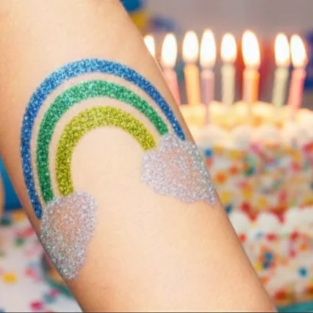 Als Make-up Artistin biete ich auch Glitzer-Tattoos an. Besonders für ältere Kinder oder Teenager sind die Tattoos sehr attraktiv. Sie bleiben bis zu einer Woche auf der Haut und sind dann einfach mit einem Schwamm abzurubbeln. Der Glitzerstaub ist biologisch abbaubar und es entsteht dabei kein Mikroplastik. Neben zahlreichen Motiven kann aus verschiedenen Glitzerfarben gewählt werden . Ein schillerndes Souvenir auf der Haut.